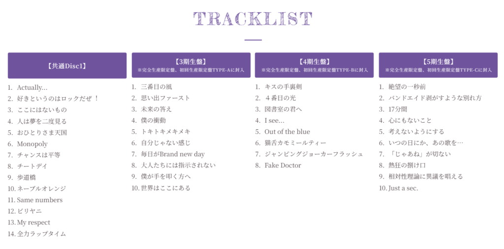 通常盤CD1枚のみ。Disc1には29thシングル「Actually…」から最新シングル「ビリヤニ」までの表題曲全曲を収録。応募特典シリアルナンバー封入(初回仕様限定特典)¥3,000