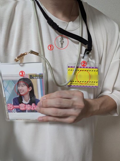 自分の写真では、首にいろいろぶら下げているため、最近は推しメンタオルは持って行っていないです!ただ、乃木坂Tシャツは着てみてもいいかもしれません!というか、乃木坂Tシャツに関わらず、メンバーが反応してくれるような服を選びましょう!!