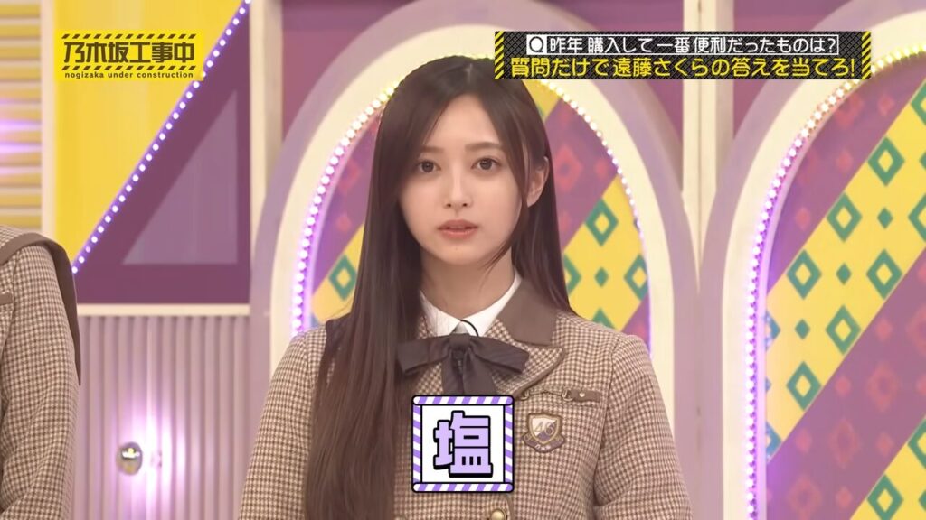 遠藤さくらちゃんのお題「昨年購入して一番便利だったものは?」に対し、井上和ちゃんは「家電ですか?」「食べられますか?」といった的確な質問を重ね、見事「ろく助の塩」という正解にたどり着きました。
