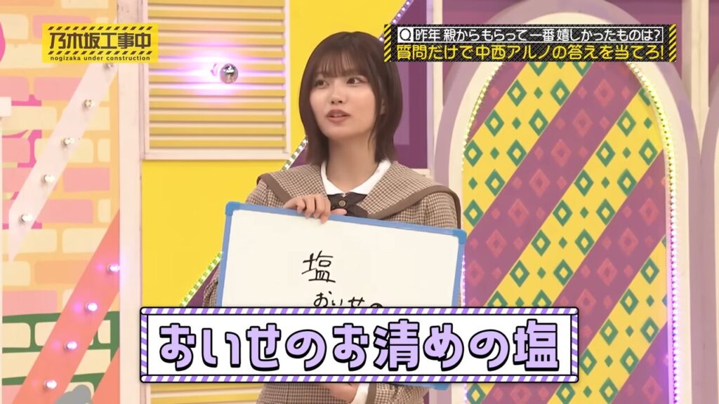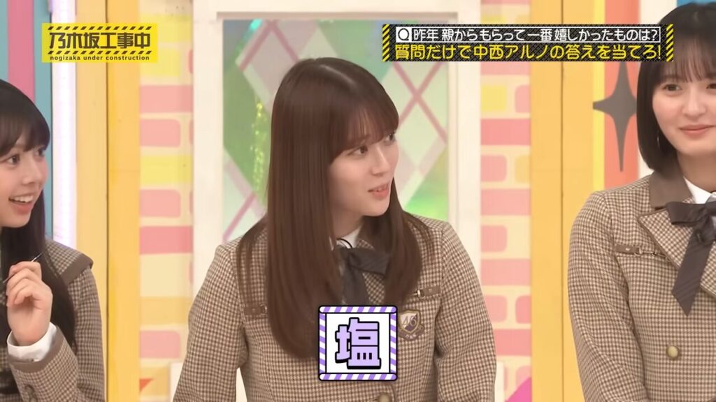 中西アルノちゃんのお題「昨年親からもらって一番嬉しかったものは?」という難問に、梅澤美波ちゃんの「白いですか?」などの質問から「塩」と解答し、見事正解しました。